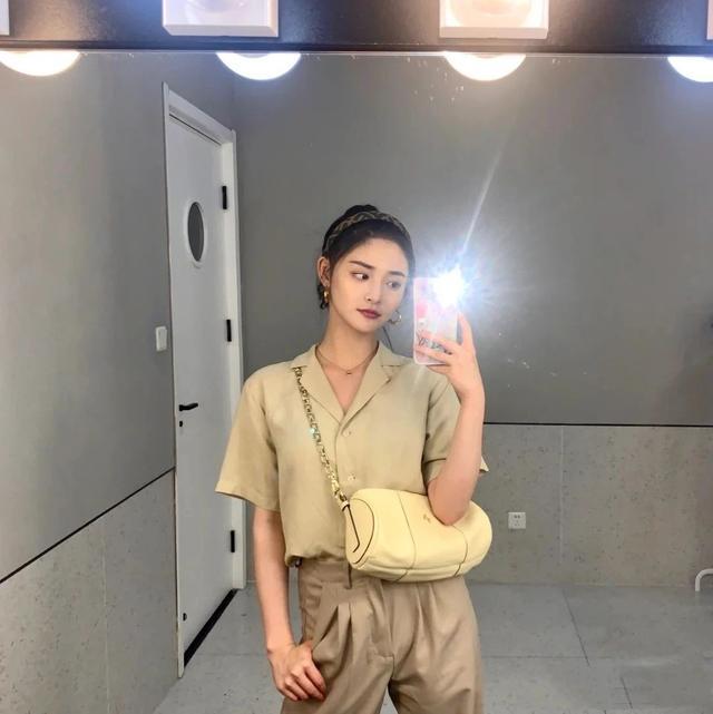 上身一件今年很火的衬衫式小上衣,无论是版型还是款式上都给人一种复古简约感,但不会显得老气。下身搭配褐色西裤,通过对颜色深浅的调节和把控,显得丰富又统一,和谐配套。宽松的西裤尽显修长的腿部线条,还显得高级有质感。