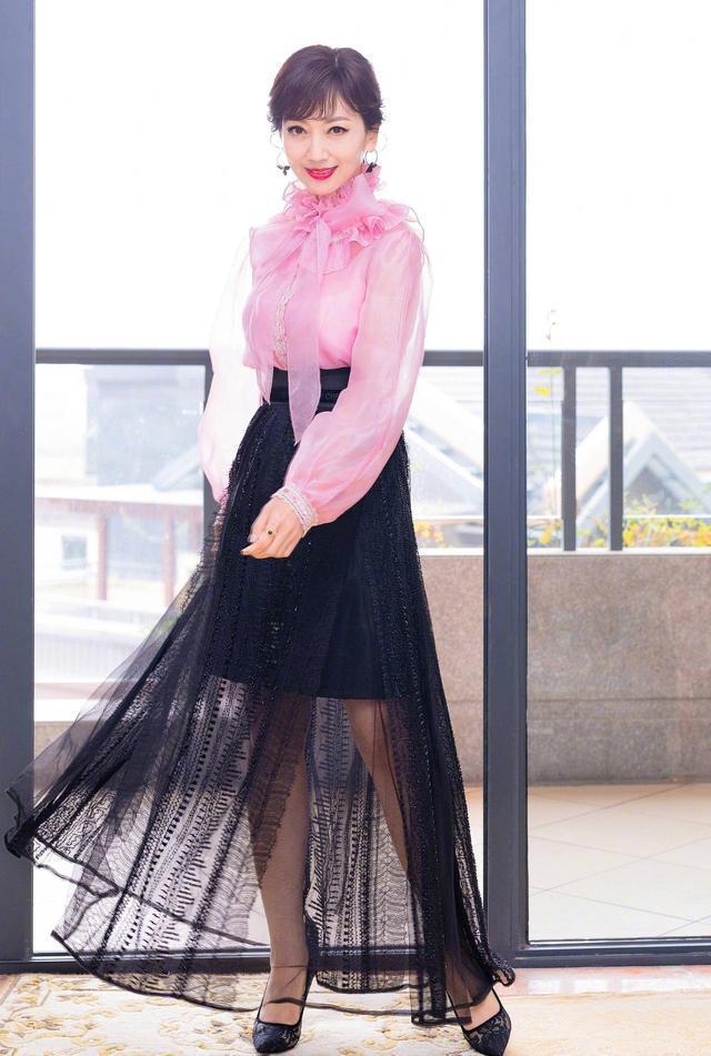就拿她这个粉色的造型来说,粉色的单品在她的私服当中出镜率非常高。或许她也是想通过这种嫩嫩的颜色,来让自己看得更加年轻,这个想法是没毛病的,只不过在款式的挑选上,她没有找到适合自己的风格。粉色衬衫因为木耳边领口和蝴蝶结的点缀,有一种复古宫廷风的感觉,糖果纸一般的色彩与光泽,结合略微透视的设计,甜美之余还有几分性感的女人味。但是这种款式,看起来膨胀感非常强烈,对于上身偏胖或者脖子偏短的女生来说简直就是灾难,下身她非常随意的搭配了一条黑色透视半身裙,尤其是外面那一层网纱的裙摆,显得有些累赘。