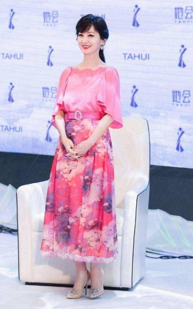要么就是这种粉色调印花裙,看着也有些用力过猛了。宽松喇叭袖上衣,依旧是粉嫩的色调,波浪形的领口搭配蕾丝花边的点缀,虽然很有女人味,不过款式上略显土气。下身搭配一条半身印花裙,花色繁复,好在深浅过度,比较柔和,看起来不至于太过花哨了。怪不得有网友评价她,就像“一个行走的鸡毛掸子”。