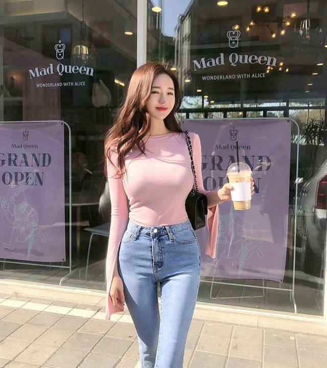 牛仔裤这种本身就是休闲裤,穿在街头,自然也一点都没有违和感。美女这款粉色的T恤,与牛仔裤搭在一起。将T恤紧紧的扎进牛仔裤里,身段的线条感就烘托了出来。这种牛仔裤的穿搭方式,适合于偏丰腴的女孩。