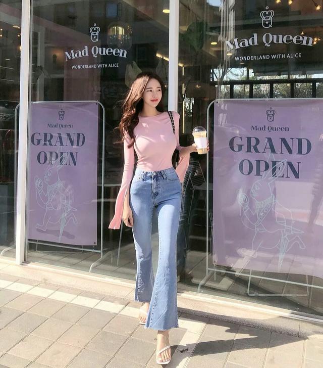 牛仔裤也能有一种轻熟的魅力。这位美女的牛仔裤采用喇叭裤的整体版型设计,再加上一双高跟鞋的时候,凸显出一双大长美腿。利用牛仔裤穿出来的腿型,匀称又修长。