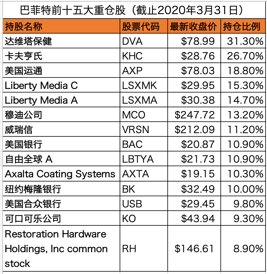 从巴菲特前15大重仓股来看,消费类的股票是股神的最爱,保健品公司达维塔和食品公司卡夫亨氏持股比例均超过了25%,除此之外还有众人皆知的可口可乐公司,以及高端家具品牌RH。