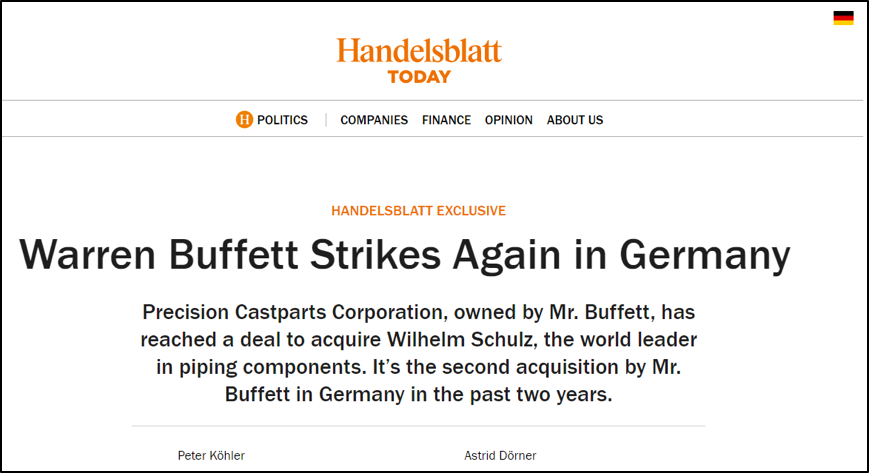 基于这一判断,2017年2月,巴菲特旗下的伯克希尔·哈撒维公司,斥资8亿欧元收购了威廉·舒尔茨公司。