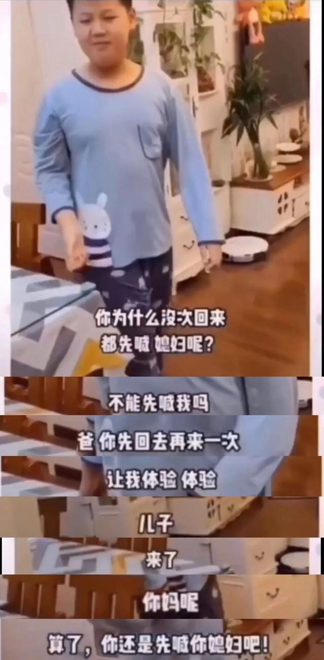 一位爸爸,每次回到家,总是先要喊媳妇,儿子看不过去,就对他爸说:「你为什么每次回来都要喊你媳妇呢?你能不能先喊喊我。爸,你出去重新来一次。」