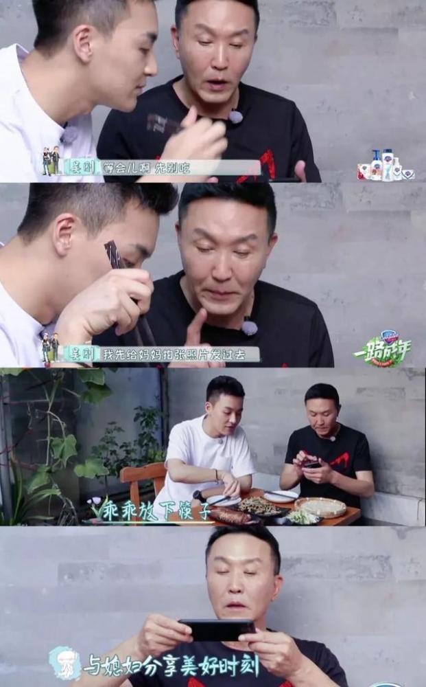 父子俩准备吃饭的时候,吴刚马上制止要下筷的儿子:「等等,我先给你妈拍张照片发过去。」