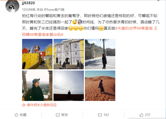 而5月20日,王雨馨助理又在社交平台上发文称,并写出了时间线,并称黄景瑜在拍《红海行动》时候(2017年)曾和王雨馨到葡萄牙去度假,那时候黄景瑜王雨馨感情都很好,只是因为当时的王雨馨不知道黄景瑜和小三走到一起,才如此开心。
