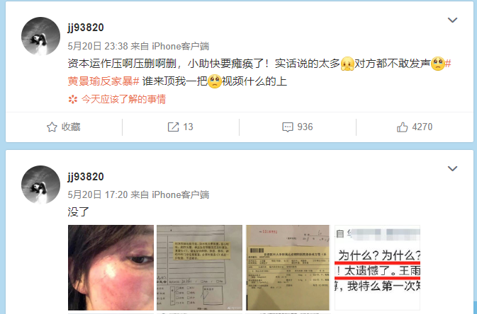 作为一个无还手之力的女孩被一个187cm大男孩子家暴,怎么又能够容忍呢?在近日王雨馨自杀事件让黄景瑜家暴事件再发酵后,尽管王雨馨没有提此事,但是作为助理的她,却看不下去,天天在社交平台上为王雨馨喊冤,为的就是要提王雨馨讨回一个公道。
