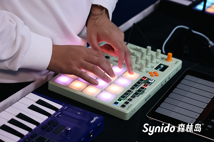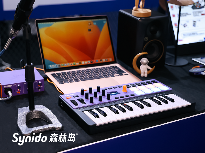 新品首秀,彰显无线创作趋势本次展会上,森林岛于今年7月新上市的25键MIDI键盘——“MIDI漫游者” 成为其展位的明星产品。这款产品以其无线设计、内置电池及标志性的高级磨砂紫配色,精准切中了当下音乐创作者对移动化、便捷性与审美个性化的核心需求,吸引了大量专业观众驻足体验,充分展现了森林岛在细分市场持续创新的技术实力与设计美学。