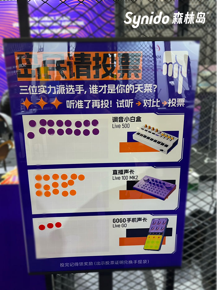 沉浸式互动,深度连接用户除了新品展示,森林岛别出心裁地策划了 “音乐巡回之旅” 主题打卡活动。展台内设置的数字乐器体验区通过1:1还原音乐人的真实创作桌搭,让观众得以零距离感受音乐工作流的魅力;而在金耳朵试炼区,调音小白盒声卡、Live 100MK2以及Gogo手机声卡同台竞技,由现场观众通过亲身试听进行投票,最终调音小白盒凭借其出色的性能与音质荣获最高人气。这一系列互动不仅提升了参与感,更让用户在体验中深化了对品牌产品实力的理解。